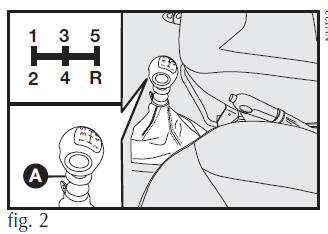 Para engrenar as marchas, pisar a fundo no pedal da embreagem e pôr a alavanca do câmbio em uma das posições do esquema na fig. 2 (o esquema também está indicado no pomo da alavanca).